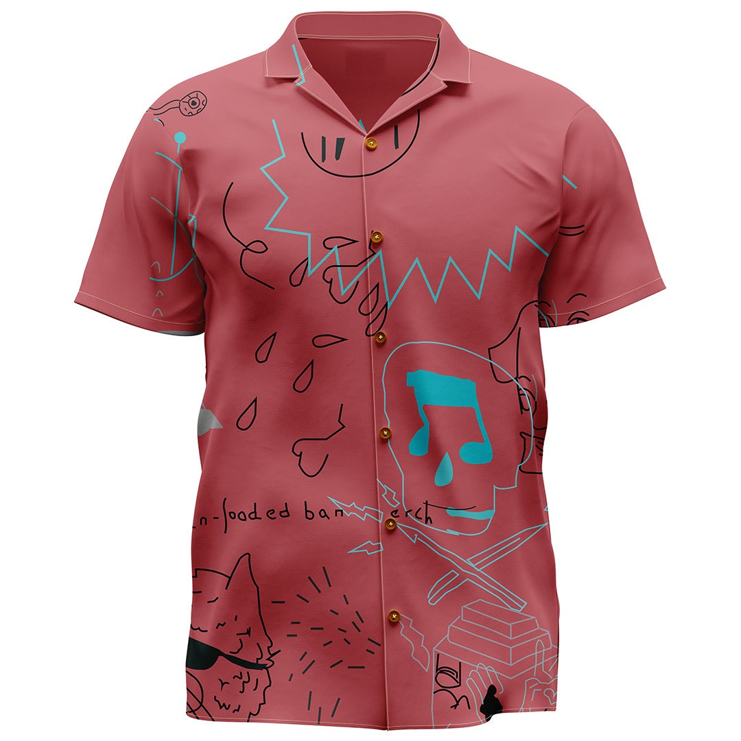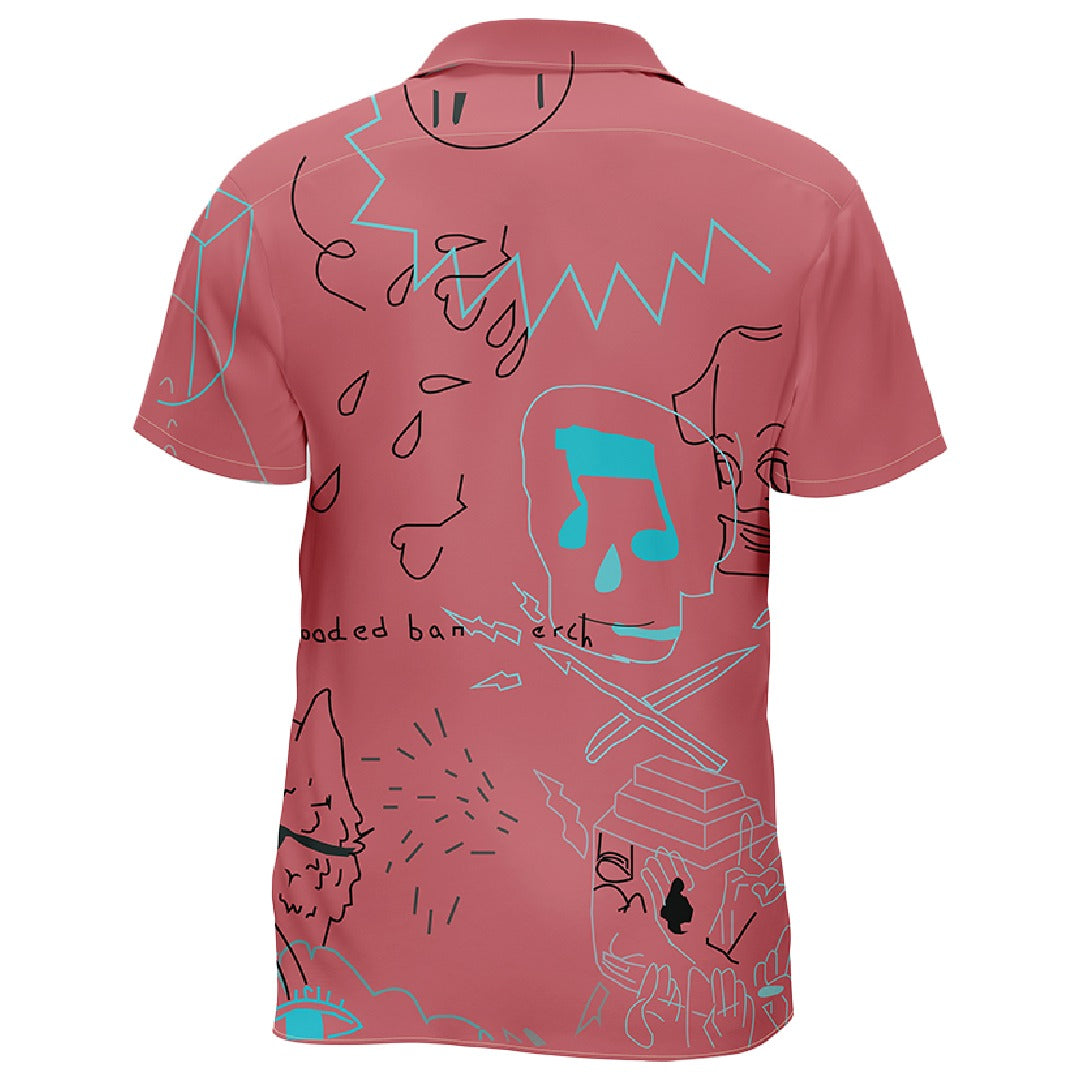 This button-up shirt features an eclectic and vibrant design that marries abstract art with playful doodles. The base color is a warm, muted rose, providing a soft background for the striking turquoise and black line art scattered across the fabric. Various sketched elements, including whimsical faces with a single tear, raindrop motifs, zigzag patterns, and what appears to be hand-written text, give the shirt an air of casual whimsy. There’s an edgy undertone to the design as well, with the inclusion of what seems like a melting record and fragmented, scribbled captions. This shirt is a statement piece that balances the quirky joy of doodles and the thoughtful expression of modern abstract art. It’s an eye-catching garment that could easily be a conversation starter, perfect for those who like to wear their creativity on their sleeve—or in this case, their entire shirt.