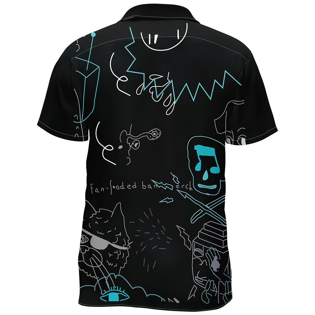 This shirt serves as a wearable canvas featuring bold, abstract doodles in a striking black and neon light blue color scheme. The abstract figures, lines, and shapes invoke a sense of freeform creativity and movement, while playful touches like the outlined face add a whimsical charm to the design. The shirt’s dark base allows the vivid doodle patterns to pop, making it a standout piece for anyone with an appreciation for artful clothing and a bold sense of style. It’s a conversation starter that melds the lines between fashion and art, perfect for casual outings where making a statement is part of the plan.
