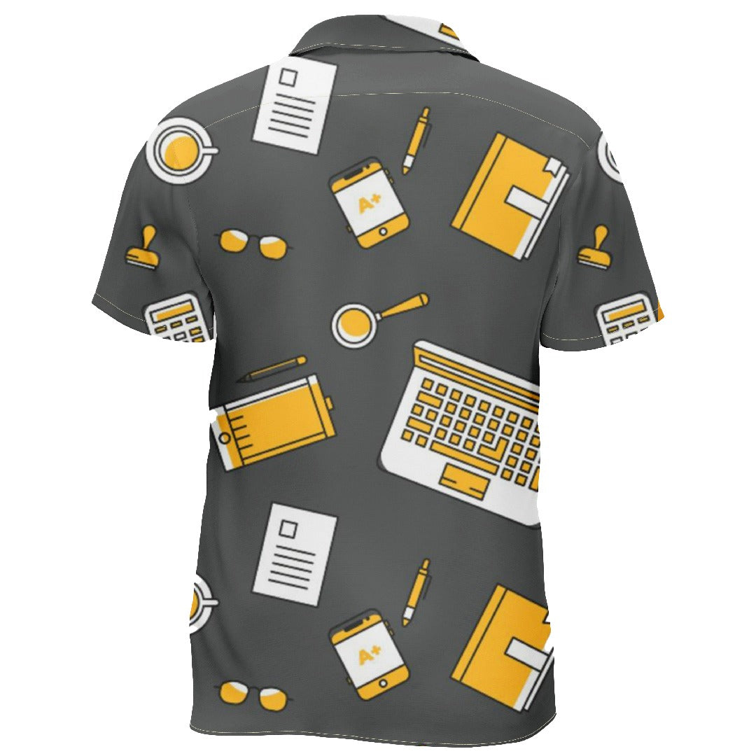 Perfect for the studious at heart, this shirt is patterned with an array of educational icons. From the classic spectacles and caffeine fix, to the textbooks and smart devices, each symbol celebrates the tools of learning and the academic process. Set against a smart gray backdrop, the yellow and white highlights are a nod to the quintessential pencil and pad. Whether you’re hitting the books or out for a coffee study break, this shirt is a sartorial nod to learners and thinkers everywhere, marrying comfort with a splash of scholarly charm.