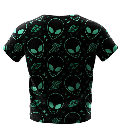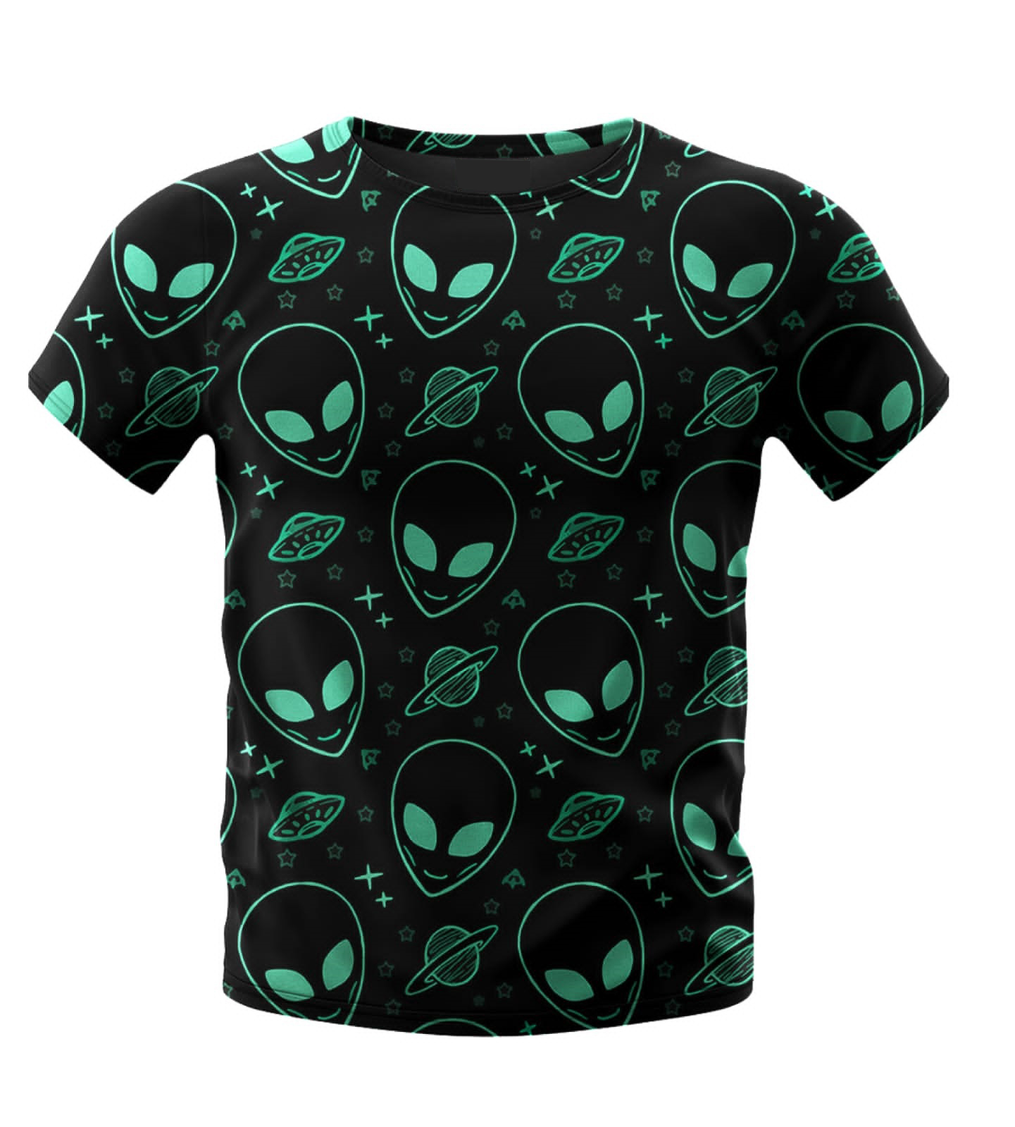 Step into the realm of the extraterrestrial with the “Cosmic Contact: Interstellar Fashion” T-shirt. This shirt boasts a bold pattern featuring stylized alien faces and spacecraft amidst a sprinkling of stars, all set against a deep space black background. The neon green accents give the design a vibrant pop, suggesting an electric energy of otherworldly encounters. This T-shirt is perfect for those with a passion for the mysteries of the universe, science fiction enthusiasts, or anyone looking to make a cosmic statement. Whether you’re attending a themed event or simply expressing your fascination with the vastness of space, this garment is sure to turn heads and spark imaginations. Wear it, and carry the intrigue of the cosmos with you.