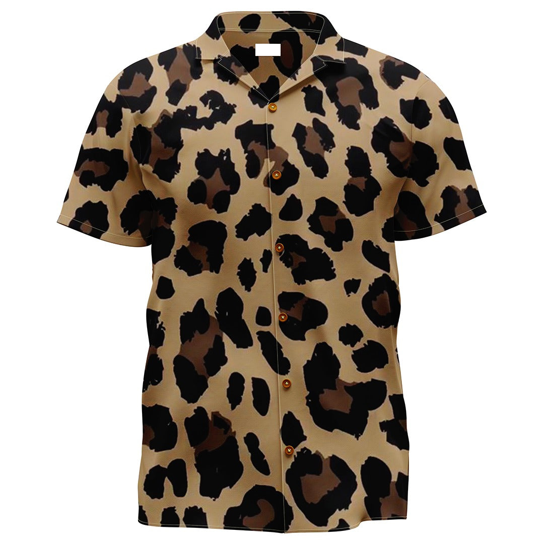 Unleash your wild side with this effortlessly chic shirt, adorned with a timeless leopard print. This short-sleeve button-up captures the essence of the untamed wilderness with its bold and exotic pattern. Set against a warm beige background, the black and brown spots offer an elegant yet adventurous vibe, perfect for those who carry the spirit of the safari within them. Pair it with your favorite jeans for a casual outing, or dress it up with slacks for an evening event. This shirt is a tribute to the majestic beauty of the wild and is designed for those who are as fearless in fashion as they are in life.