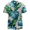 Embrace the essence of summer with this breezy button-up shirt, adorned with lush tropical foliage against a backdrop of crisp white and navy stripes. The print features rich shades of blue and green monstera leaves that seem to sway with an unseen breeze, evoking the relaxed feel of a coastal getaway. The contrasting stripes offer a structured look that complements the organic shapes of the leaves, creating a harmonious balance between the natural and the nautical. This shirt is perfect for those who appreciate a touch of tropical flair without sacrificing sleek design, suitable for both casual outings and dressier summer events.