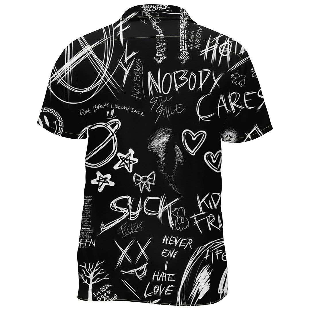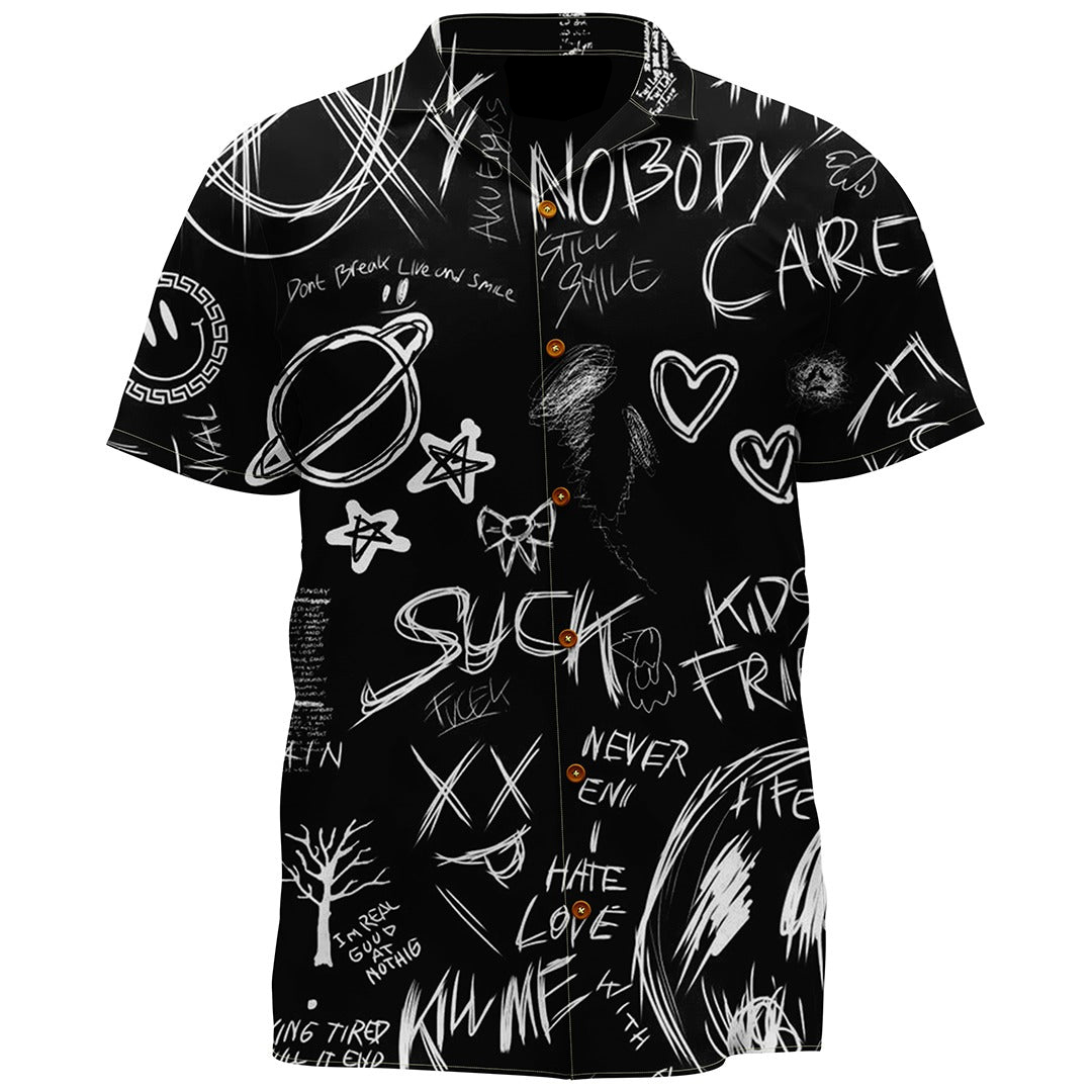 This striking shirt captures the essence of street art with its graffiti-inspired doodles and bold statements. Each element, from the scrawled words “Nobody Cares” to the stark x-marks and hearts, tells a story of rebellion, individualism, and the complex tapestry of human emotions. The monochromatic color scheme allows for each hand-drawn icon to stand out, making the shirt a portable mural of personal expression. Designed for the bold and the outspoken, this shirt is not just apparel—it’s a declaration of self in the urban landscape.